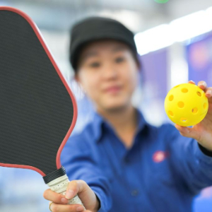 鲍雨彤展示利用碳纤维制作的球拍(9月17日摄)。