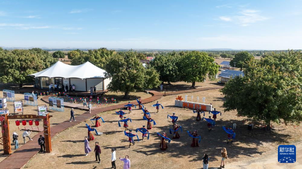 9月27日,演员在兴安盟科尔沁右翼中旗五角枫生态旅游景区跳舞(无人机照片)。