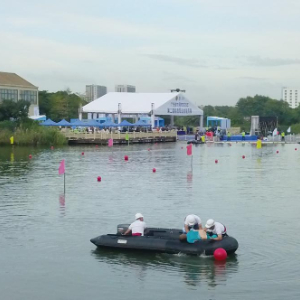 9月28日,在驾驶橡皮艇救生比赛项目中,参赛选手把道具假人转移到岸上。