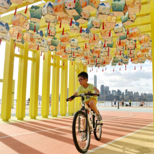 9月27日,在香港东岸公园,一名男孩骑车从中秋彩灯下经过。