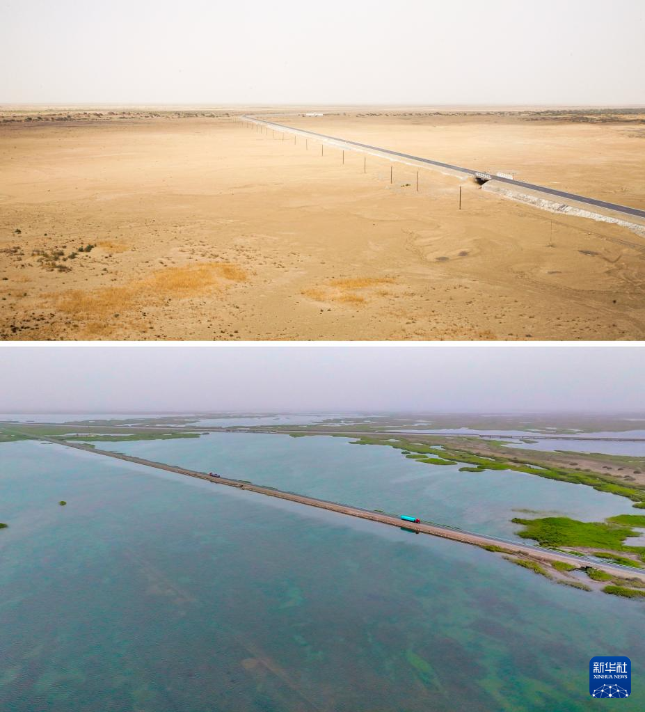 拼版卫星照片:上图为2005年12月卫星拍摄的干涸的台特玛湖及周边区域;下图为2024年8月卫星拍摄的台特玛湖及周边区域。对比可见该地区水域的显著变化。