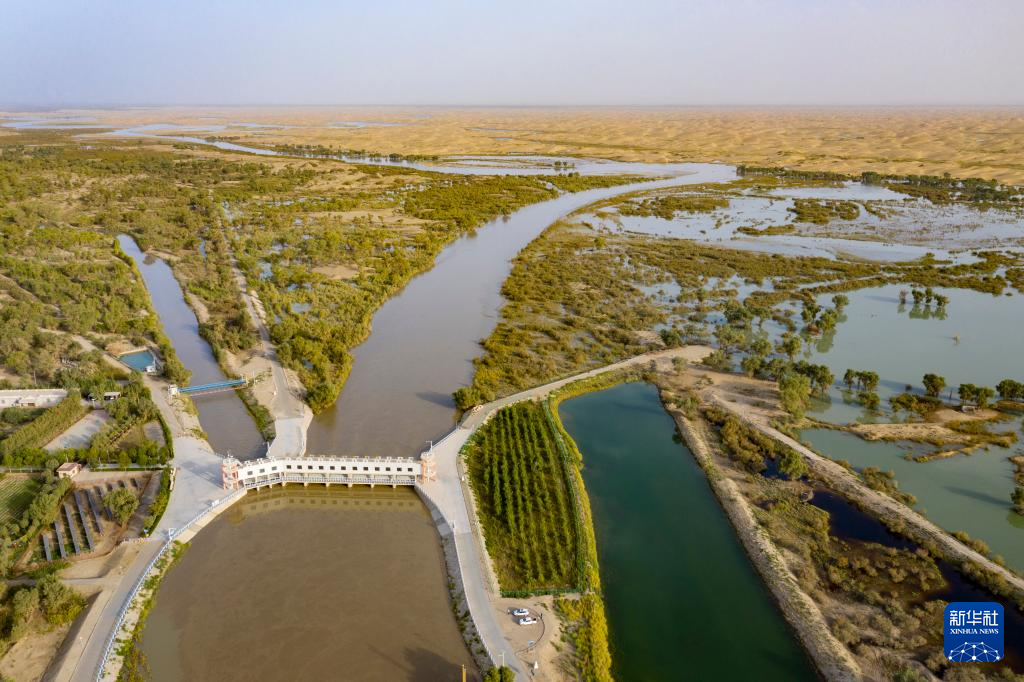 这是9月20日在新疆巴音郭楞蒙古自治州尉犁县拍摄的塔里木河阿其克河口分水枢纽(无人机照片)。这是塔里木河流域综合治理的重要工程之一。