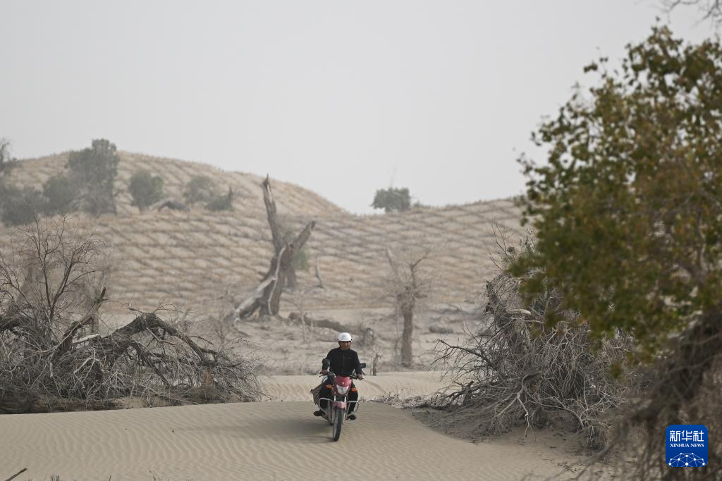 9月19日,新疆巴音郭楞蒙古自治州尉犁县国有林管理局护林员艾力·尼亚孜骑摩托在管护地巡视。