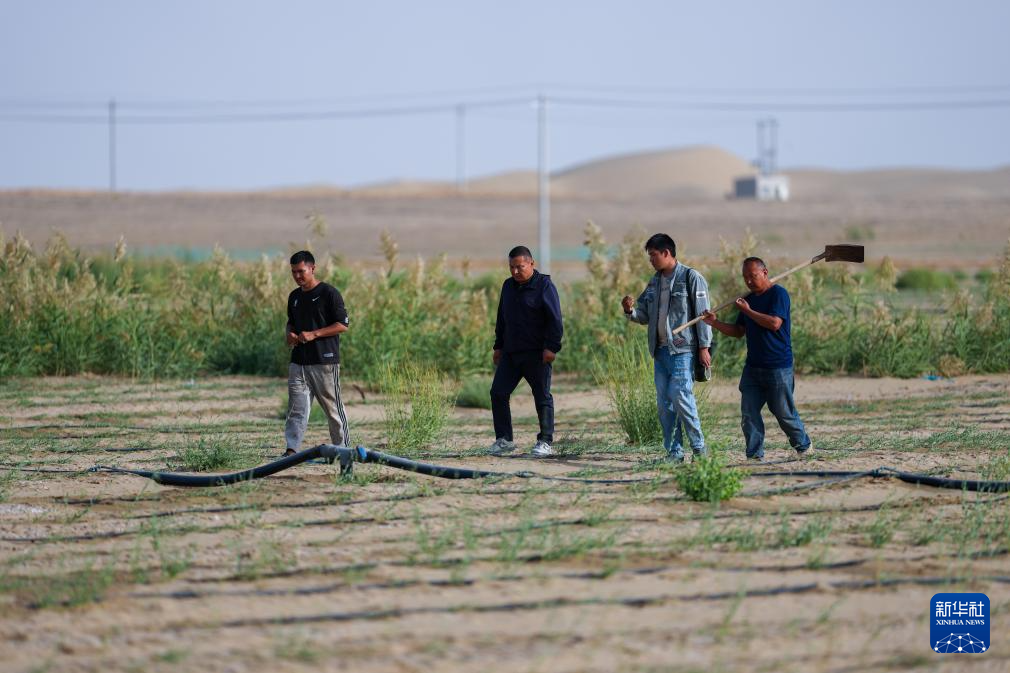 9月20日,在新疆巴音郭楞蒙古自治州尉犁县一处罗布麻种植基地,工作人员在查看罗布麻长势。当地通过发展罗布麻产业,实现生物固沙并带动经济发展。