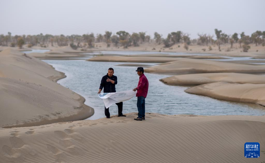 9月19日,在新疆巴音郭楞蒙古自治州尉犁县境内的塔克拉玛干沙漠引洪补水生态渠旁,护林员艾力·尼亚孜(左)和同事在开展工作。
