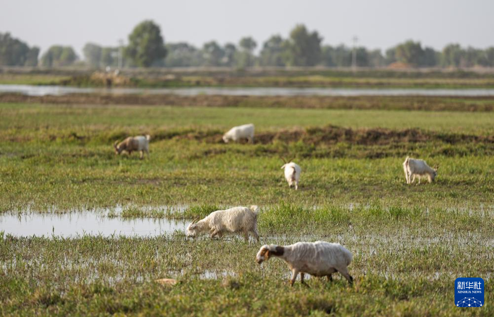 这是9月20日在新疆巴音郭楞蒙古自治州尉犁县的塔里木河流域湿地拍摄的羊群。