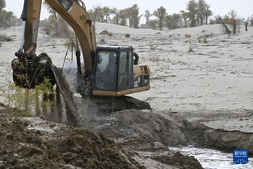 9月19日,工人在新疆巴音郭楞蒙古自治州尉犁县境内的塔克拉玛干沙漠驾驶挖掘机挖掘引洪补水生态渠。