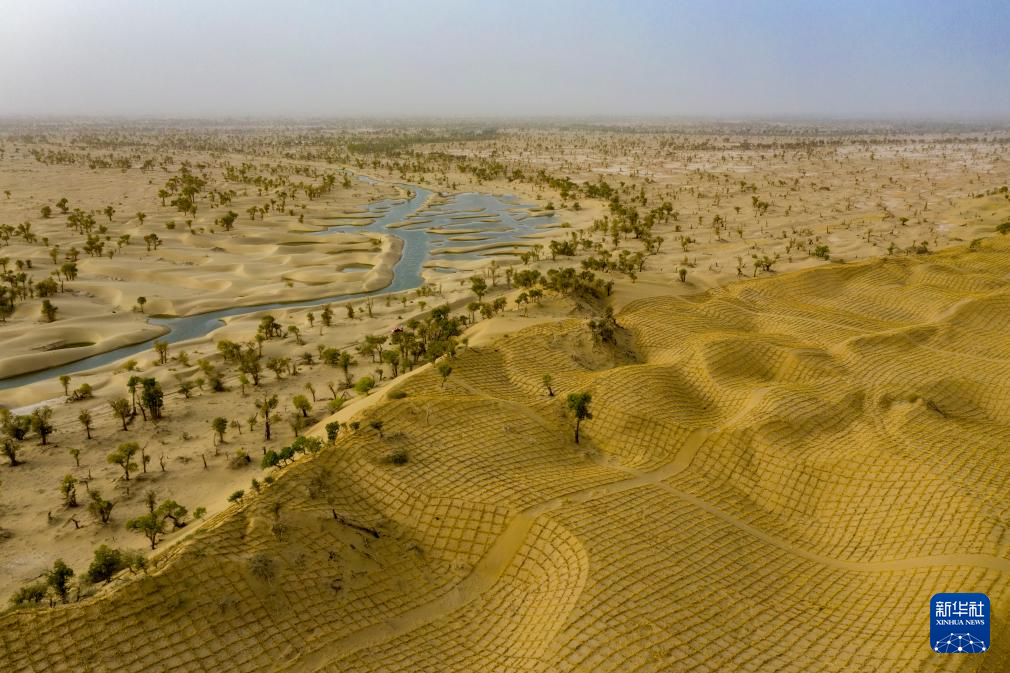 如今,站在塔里木河畔,绵延的胡杨林、草方格与波光粼粼的河面相互映衬。绿锁流沙为当代计,生态安全为万世谋。作为塔克拉玛干沙漠绿色阻沙防护带工程的重要组成部分,塔里木河生态输水工程为塔克拉玛干沙漠增添新绿,打造成沙漠中的“绿色长廊”。