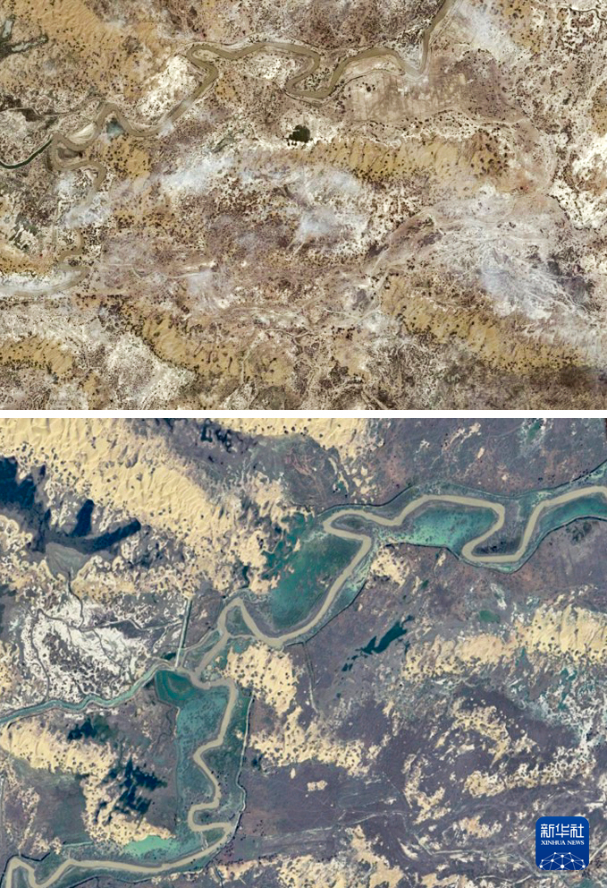 拼版卫星照片:上图为2010年8月14日拍摄的新疆巴音郭楞蒙古自治州尉犁县境内的塔里木河支流乌斯满河和周边地区;下图为2024年8月8日拍摄的新疆巴音郭楞蒙古自治州尉犁县境内的塔里木河支流乌斯满河和周边地区。该地区植被覆盖度和胡杨林地面积显著提升。
