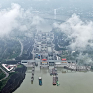 10月1日,在湖北省宜昌市,船舶有序通过三峡双线五级船闸(无人机照片)。