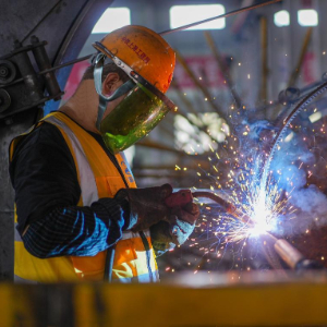10月1日,工人在位于江苏省兴化市陈堡镇的中铁上海工程局盐宜铁路项目部钢筋加工场进行焊接作业。