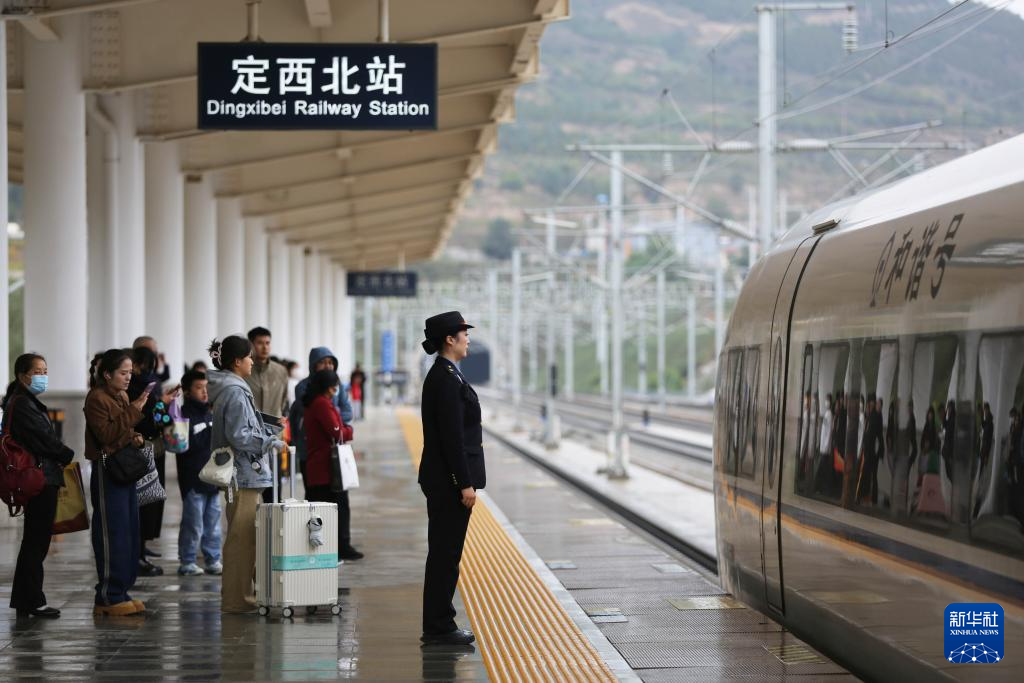 10月1日,宝兰高铁甘肃定西北站工作人员在站台上接车。