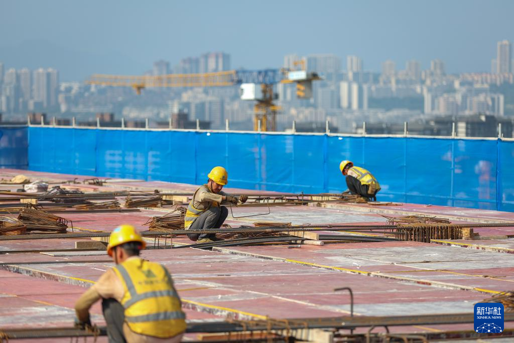 10月1日,在重庆市两江新区,中建八局的施工人员在两江新区礼嘉创新中心项目进行绑钢筋作业。