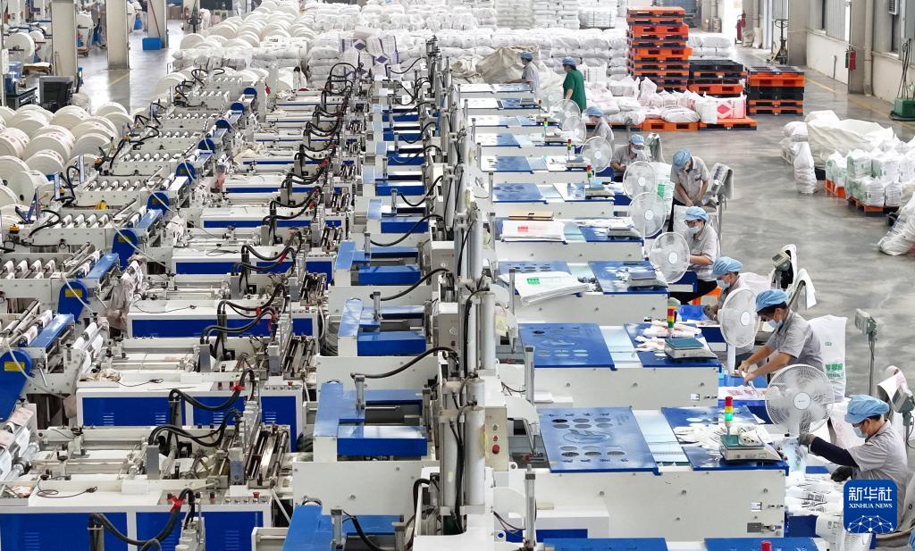 10月1日,在湖南省衡阳市衡山县经济开发区,荣宸塑业有限公司员工在生产线上作业(无人机照片)。