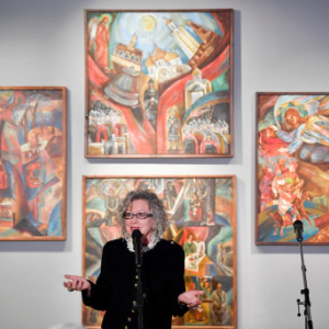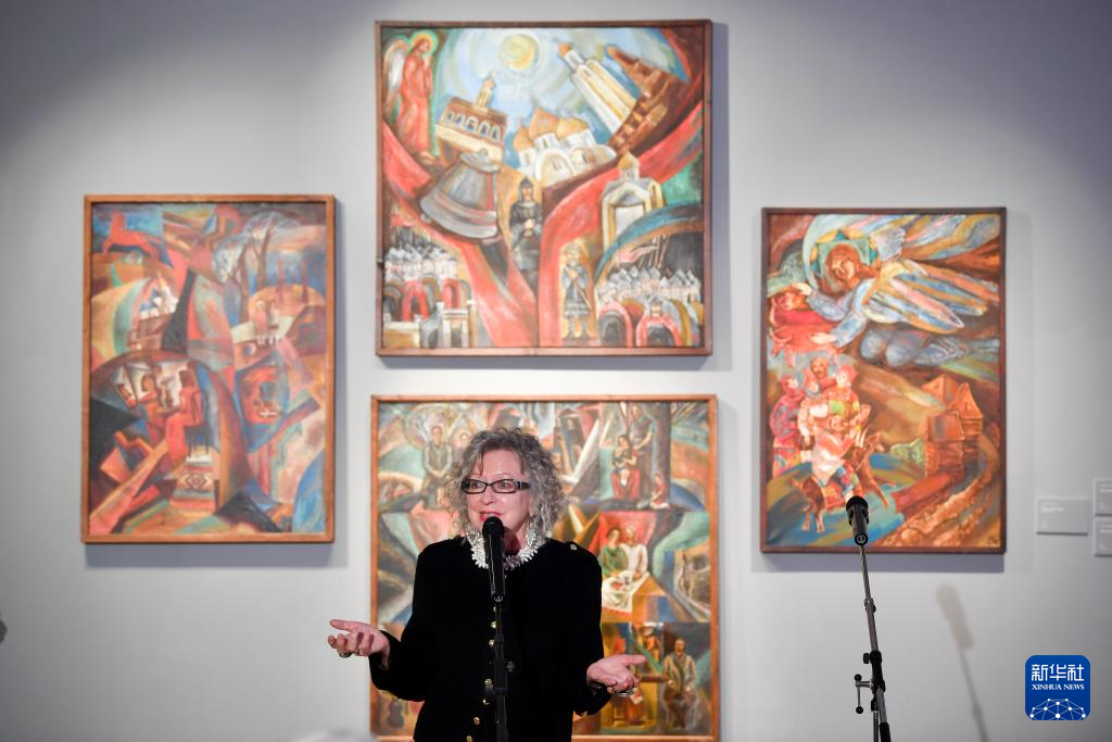 9月30日,在俄罗斯莫斯科电影制片厂画廊,伊琳娜·扎哈罗娃在“命运之织”艺术展开幕式上讲话。