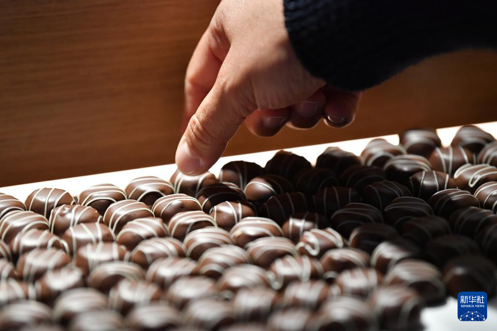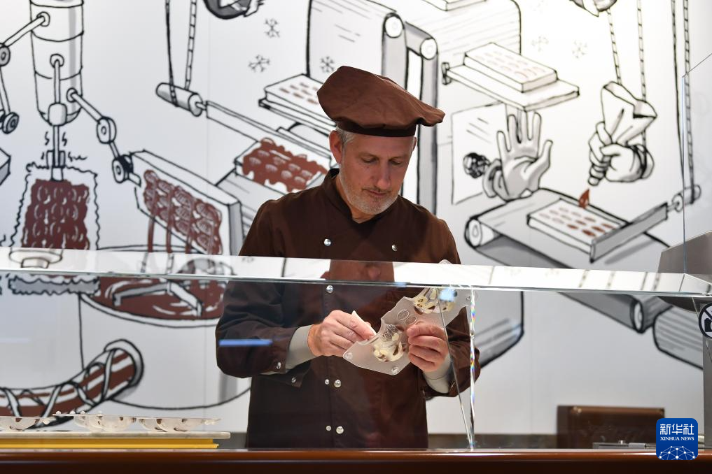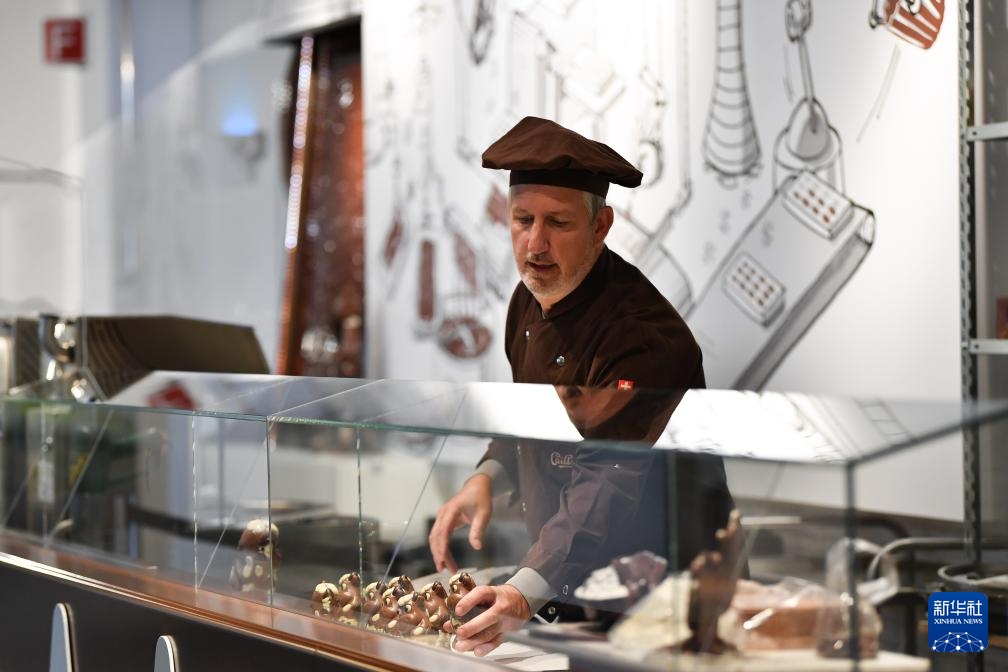 10月1日,在瑞士格吕耶尔地区布罗克的凯雅巧克力博物馆,巧克力制作师在摆放动物形巧克力。