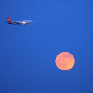 10月7日,在浙江省温州市龙湾区上空,一架飞机与月亮相映成趣。