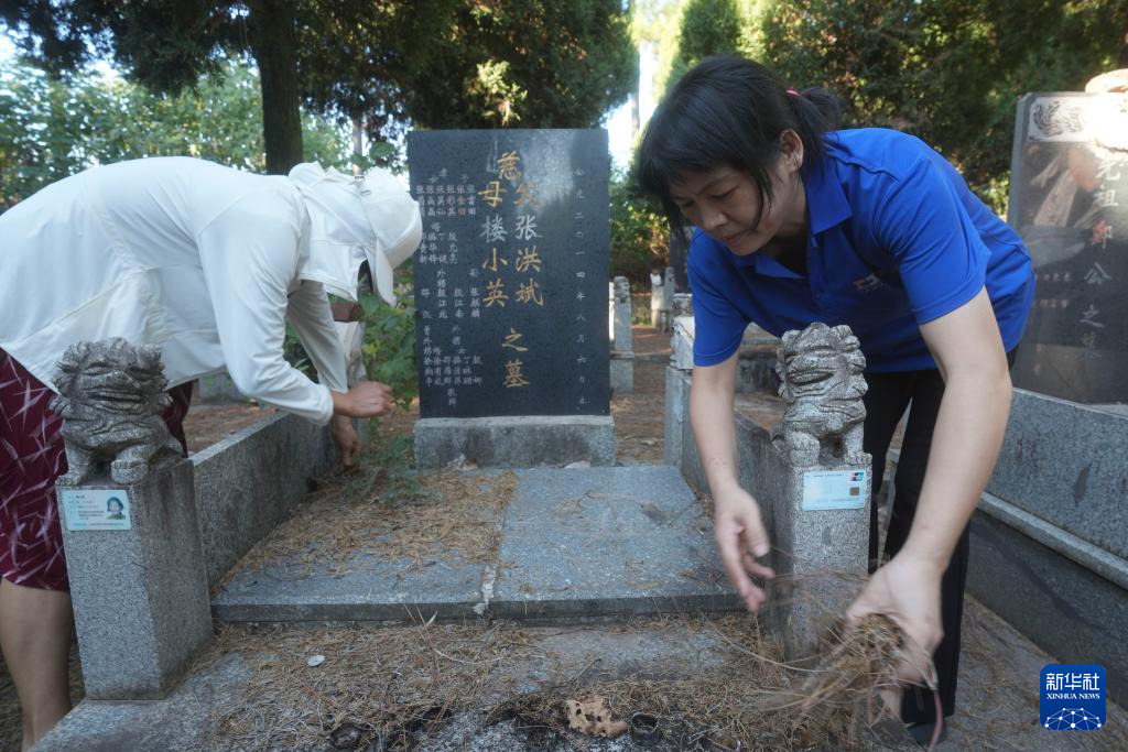 10月11日,在浙江省金华市的一处公墓,被张洪斌夫妇抚养长大的张菊菊(右)和另一名当年被张氏夫妇抚养长大的孩子来清理两位老人的墓碑。