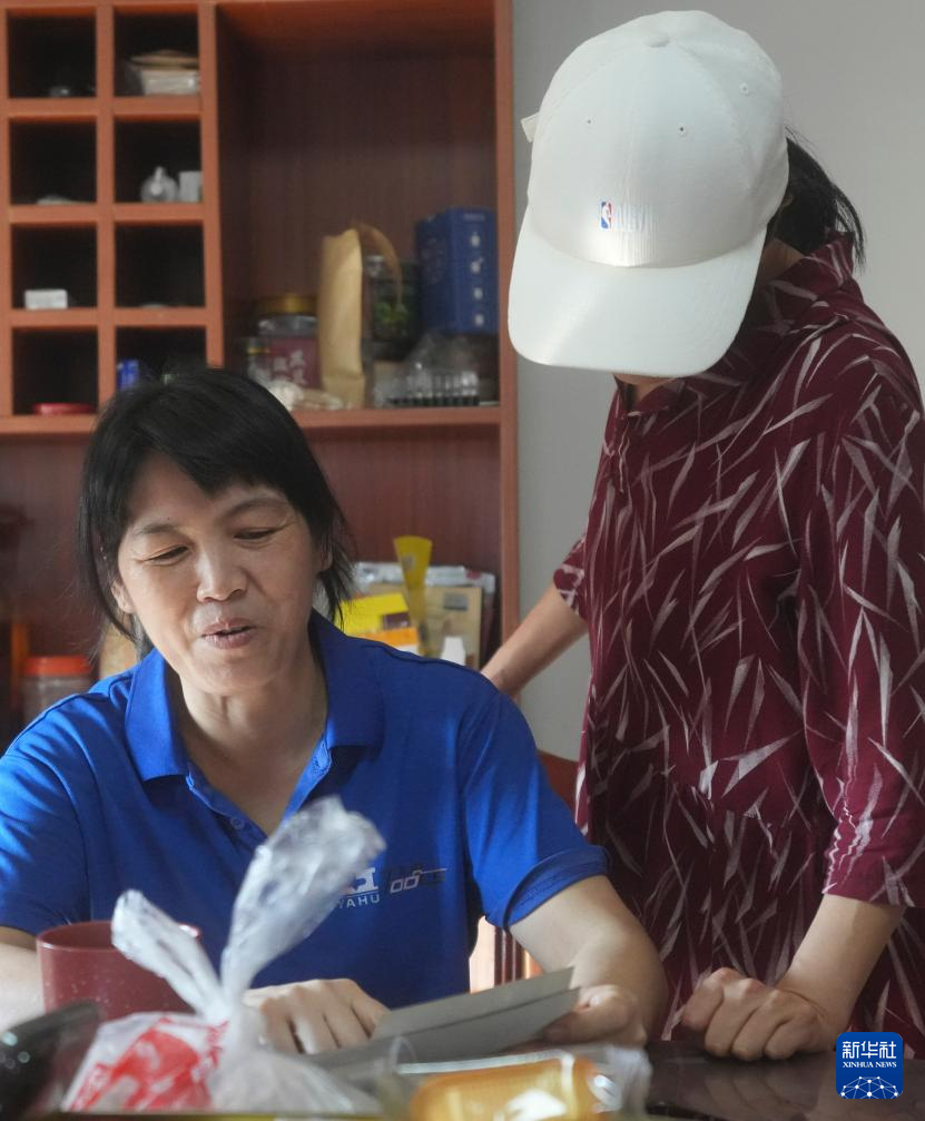 10月11日,李晓果(左)在被张洪斌夫妇抚养长大的张菊菊家中与她交流。