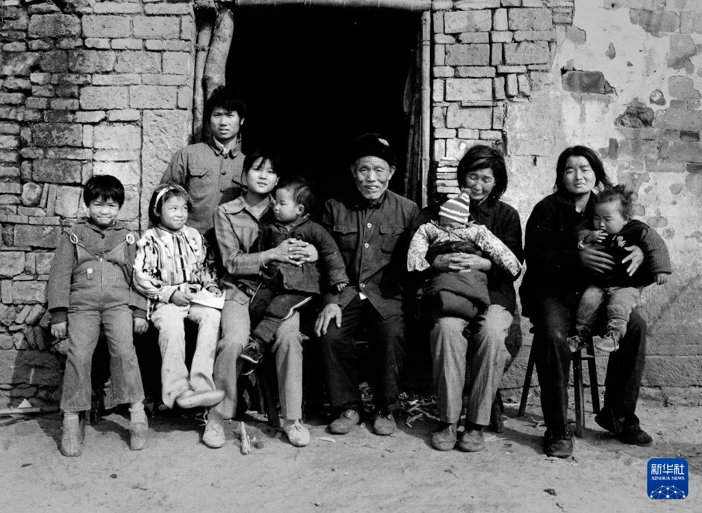 张洪斌和楼小英夫妇与孩子们在老屋前合影(1988年1月摄)。