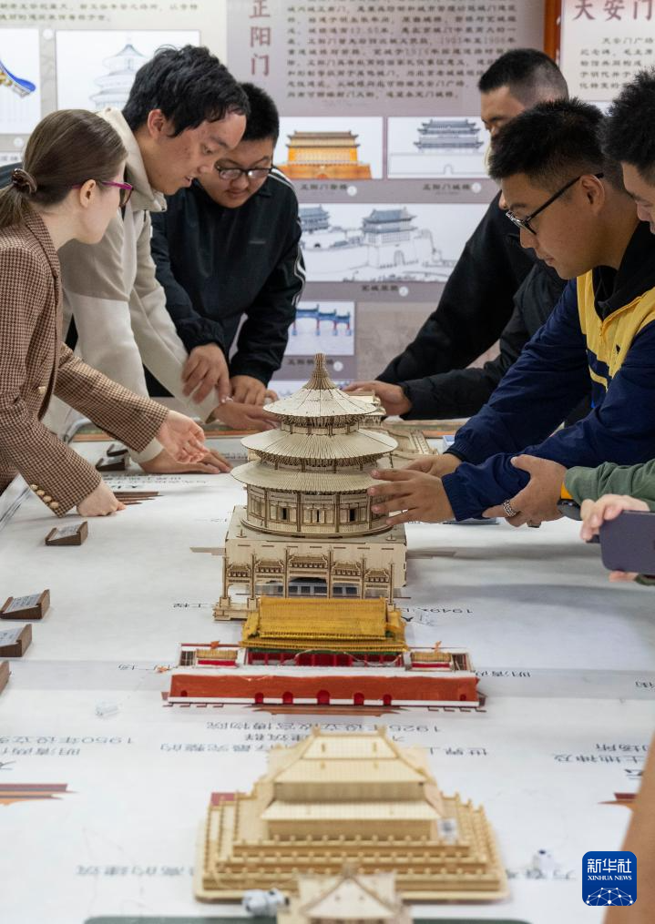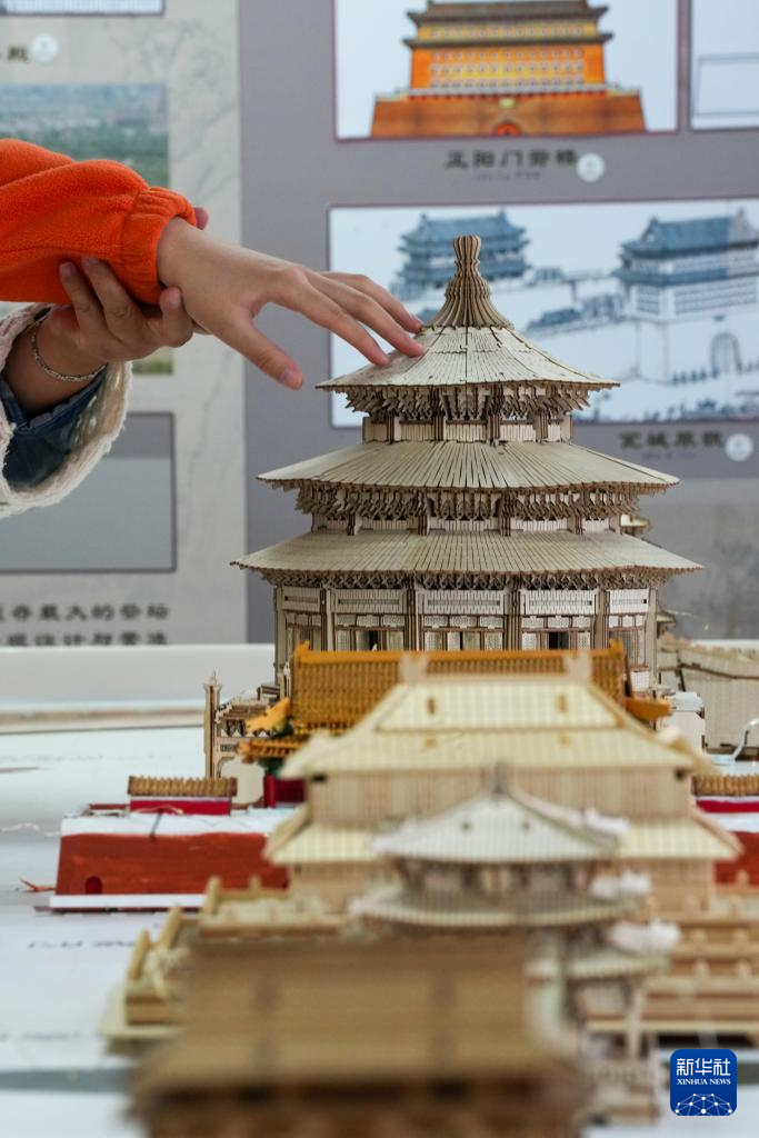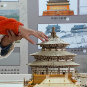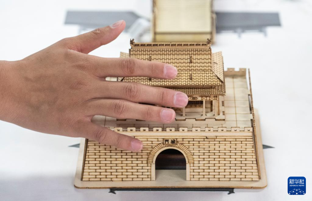 10月13日,视障人士在工作人员帮助下,触摸北京中轴线建筑模型。