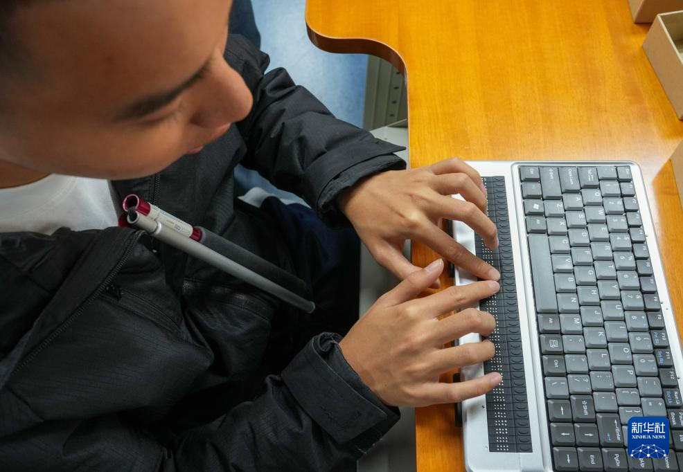 10月13日,视障人士在发布会后,体验有点显器的盲文笔记本电脑。