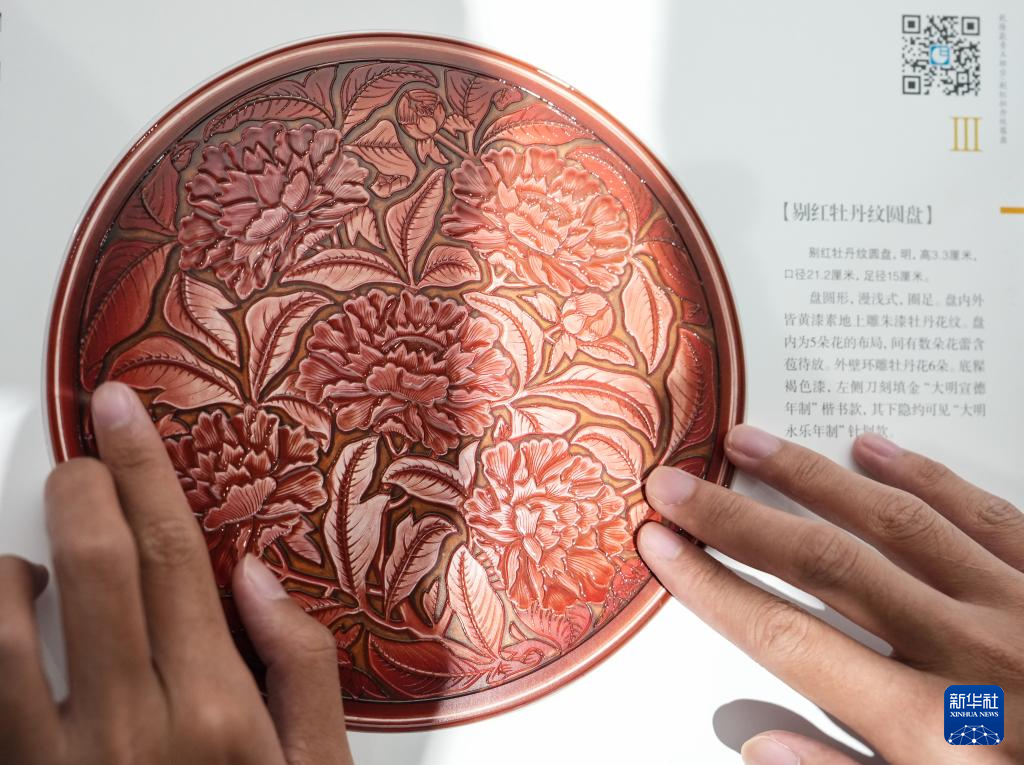10月13日,视障人士在发布会后,欣赏无障碍版《触摸故宫珍宝》中的剔红牡丹纹圆盘。
