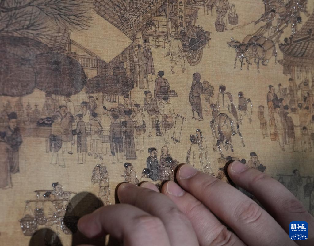 10月13日,视障人士在发布会后,欣赏无障碍版《触摸<清明上河图>》。