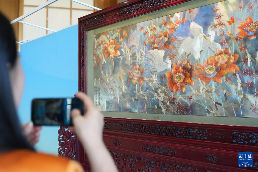 这是在北京举行的全球妇女峰会现场拍摄的江再红的湘绣作品《千里江山图》局部(10月13日摄)。