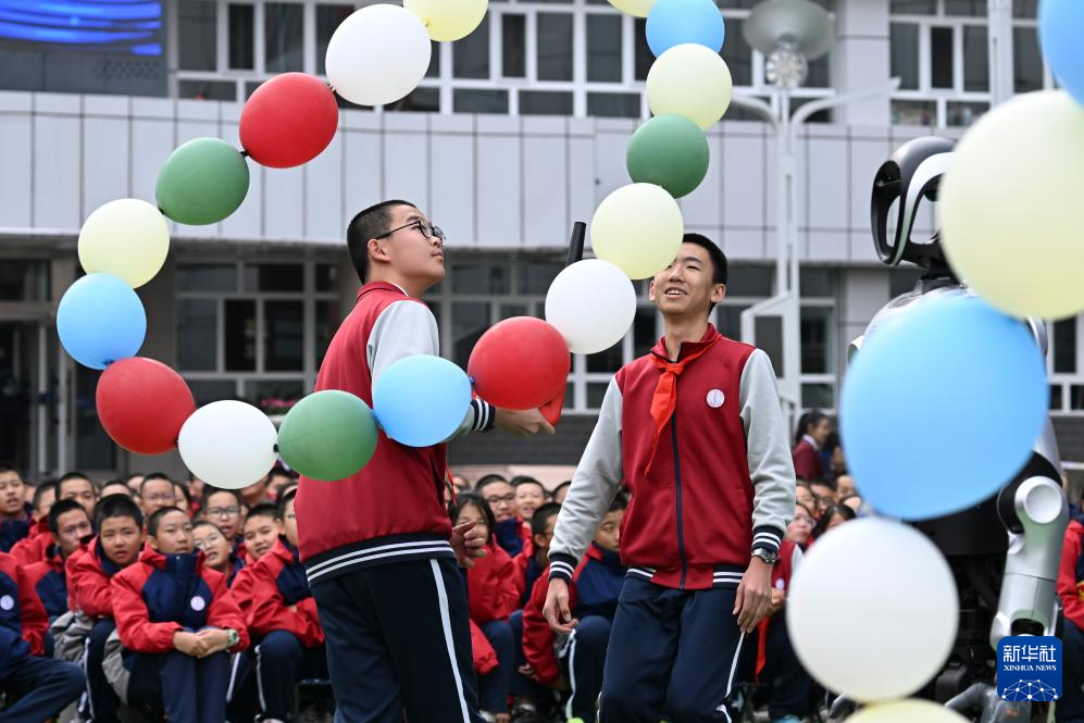 10月13日,新疆生产建设兵团第一中学学生在科技节开幕式上观看智能机器人跳舞。