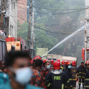 10月14日,在孟加拉国首都达卡,消防人员在火灾现场救援。