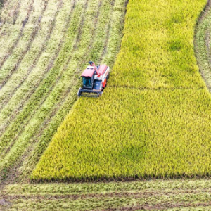 10月15日,在湖南省娄底市双峰县荷叶镇白泥村,农民驾驶农机收割晚稻(无人机照片)。