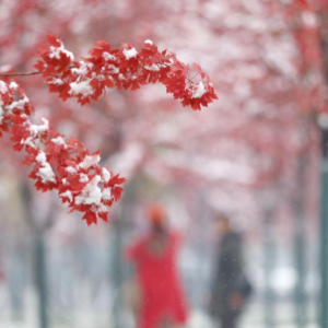 10月17日,游客在哈尔滨冰雪大世界枫林中赏雪。