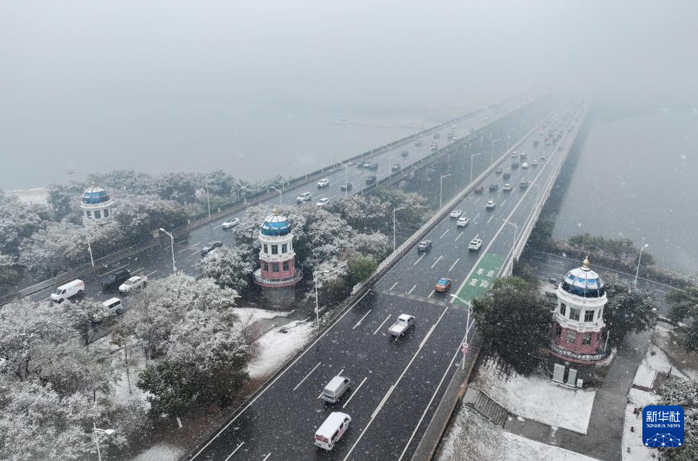 这是10月17日拍摄的雪中的哈尔滨公路大桥(无人机照片)。