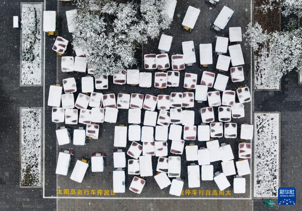 这是10月17日在哈尔滨市太阳岛风景区拍摄的落满积雪的自行车车篷(无人机照片)。
