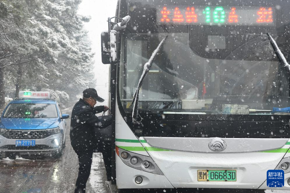 10月17日,在绥化市北林区,市民在雪中乘坐公交车出行。
