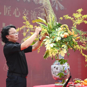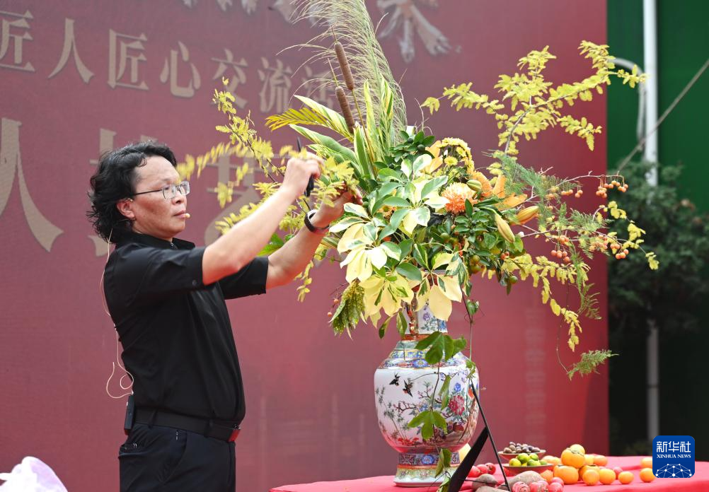10月18日,匠人在技艺展示活动中进行插花艺术表演。