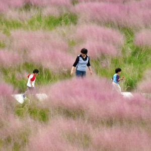 10月18日,游客在山东省临沂市平邑县柏林镇粉黛乱子草花田游玩(无人机照片)。