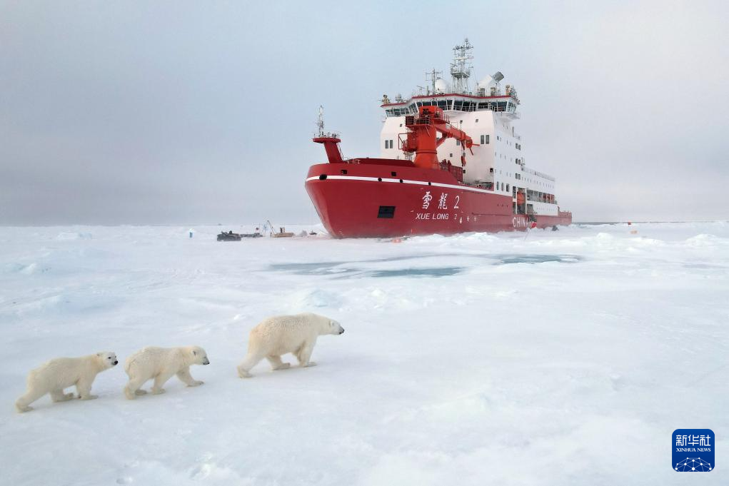 8月31日,北极熊妈妈带着宝宝来到长期冰站作业区“拜访”(无人机照片)。