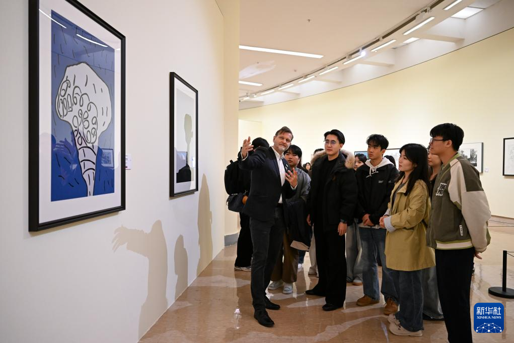 10月19日,参展嘉宾(左一)为参观者讲解艺术作品。