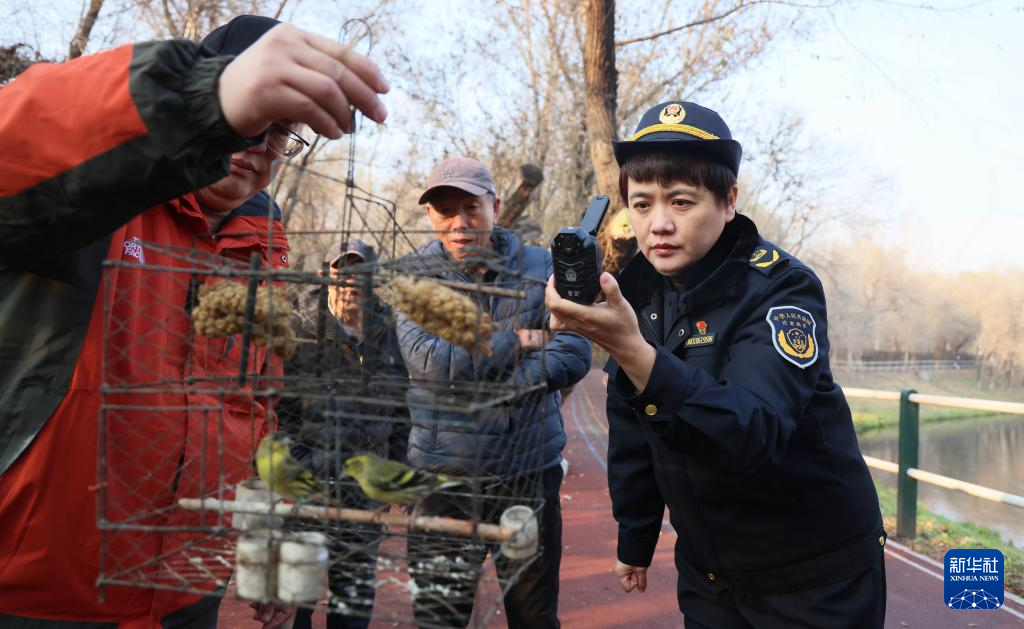 哈尔滨野保志愿者团队志愿者放飞被捕鸟笼捕获的鸟类(2023年11月4日摄)。