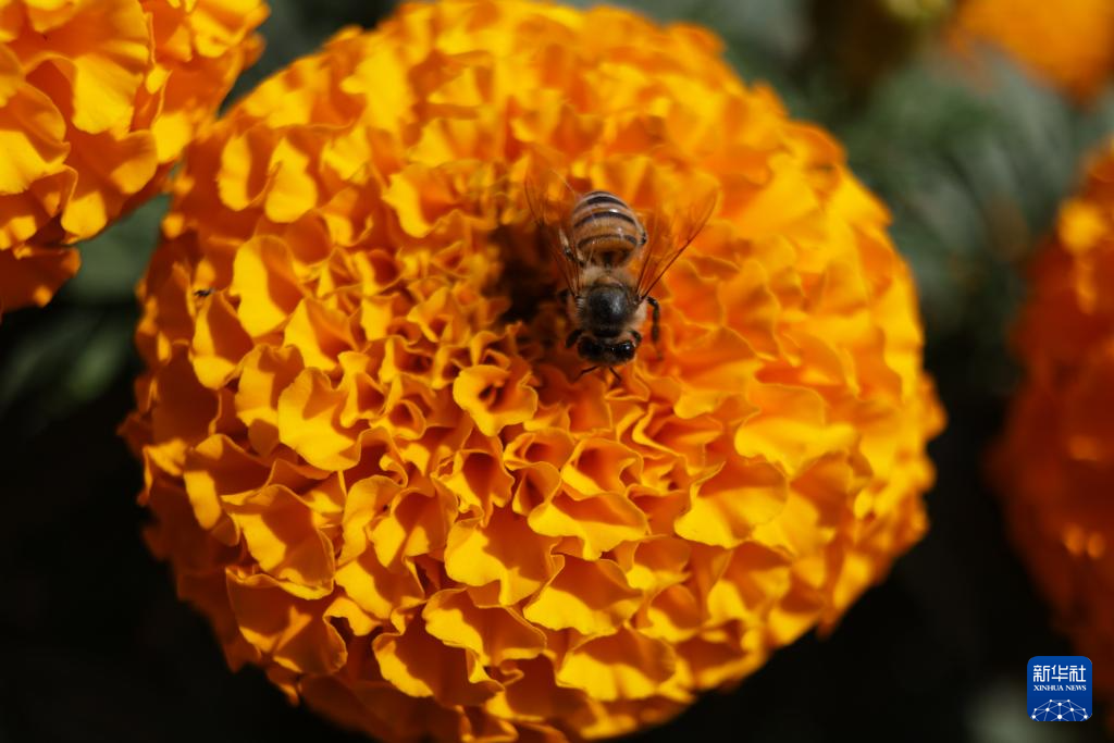 10月21日,在墨西哥首都墨西哥城,一只蜜蜂停留在万寿菊上。