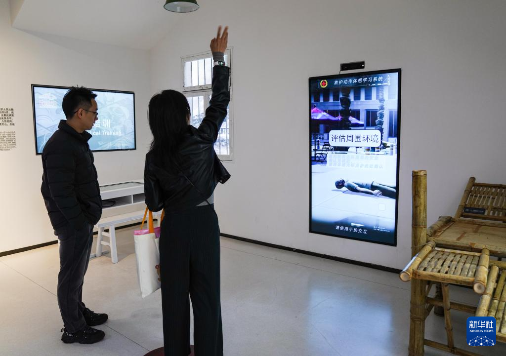 10月25日,参观者在中国红十字会救护总队贵阳图云关抗战纪念馆内体验救护动作体感学习系统。