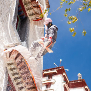近日,西藏布达拉宫迎来一年一度的粉刷“美容”。工作人员和志愿者将粉刷材料按比例混合,经过滤后对布达拉宫墙体进行喷涂,让建筑更加美观。