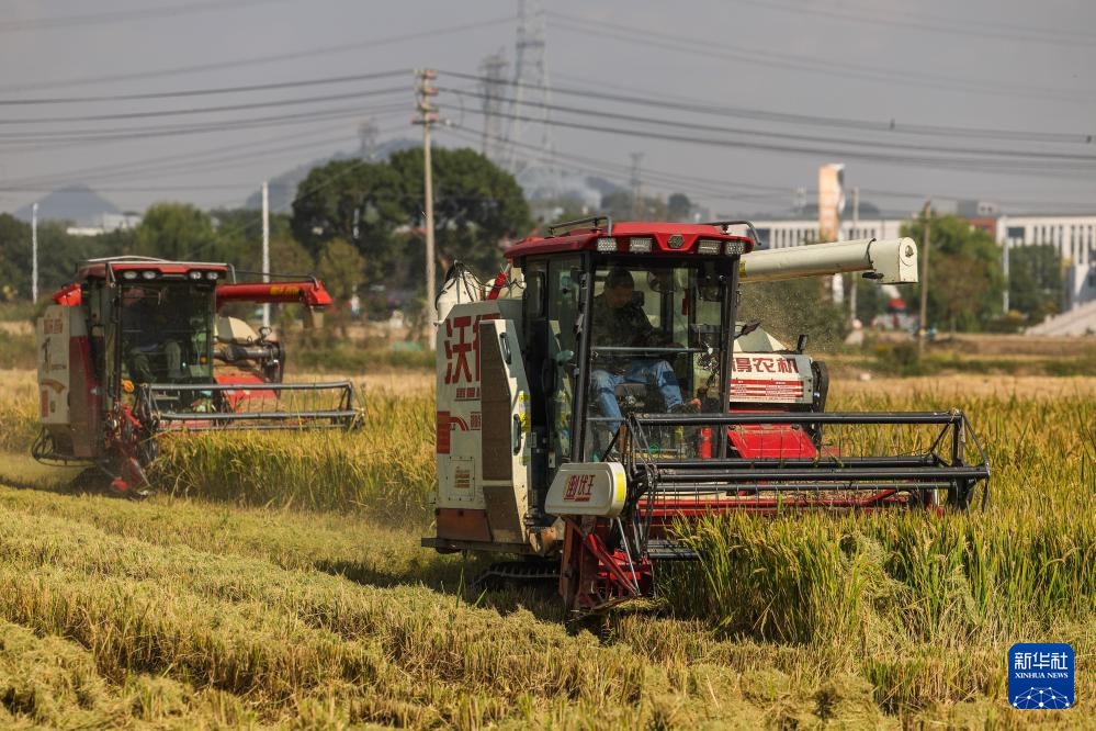 10月29日,工人操作收割机在东林镇保国村的水稻田里收割稻谷。