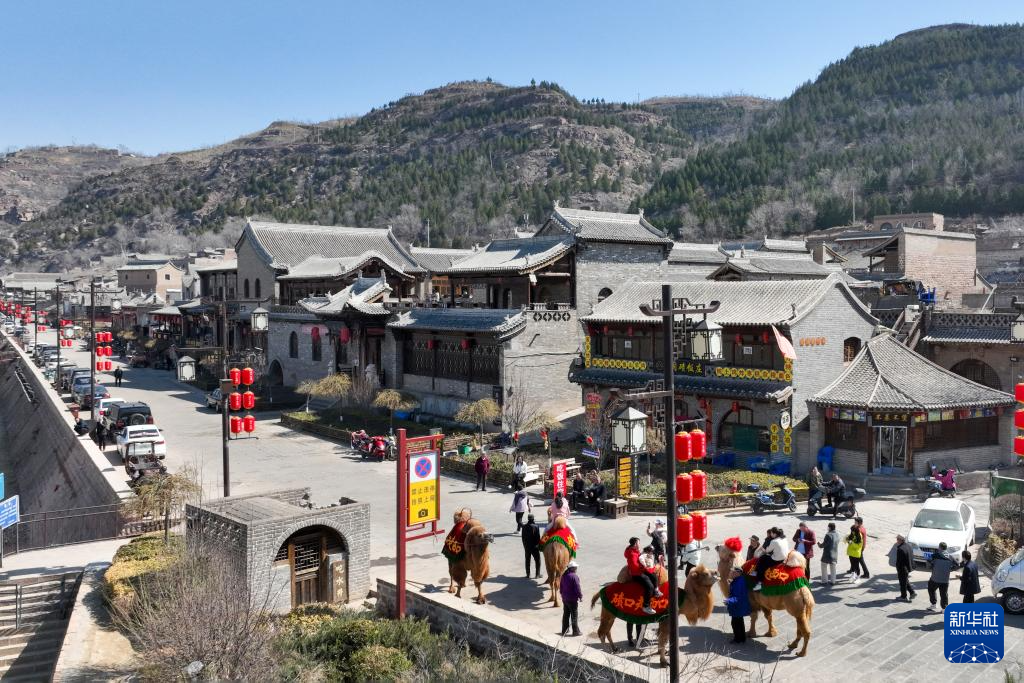 游客在碛口古镇骑骆驼(3月19日摄,无人机照片)。