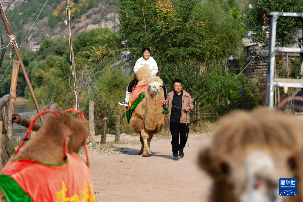 在山西省吕梁市临县碛口古镇,一位游客在骑骆驼(10月30日摄)。