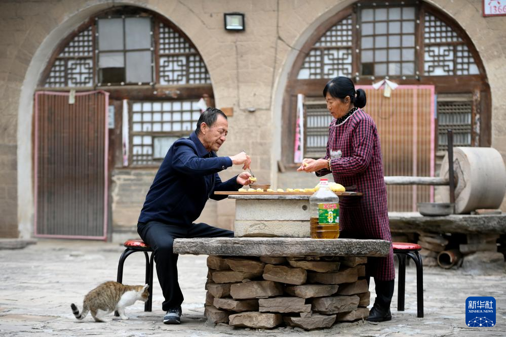 在山西省吕梁市临县碛口古镇,村民在院子里做油糕(10月30日摄)。