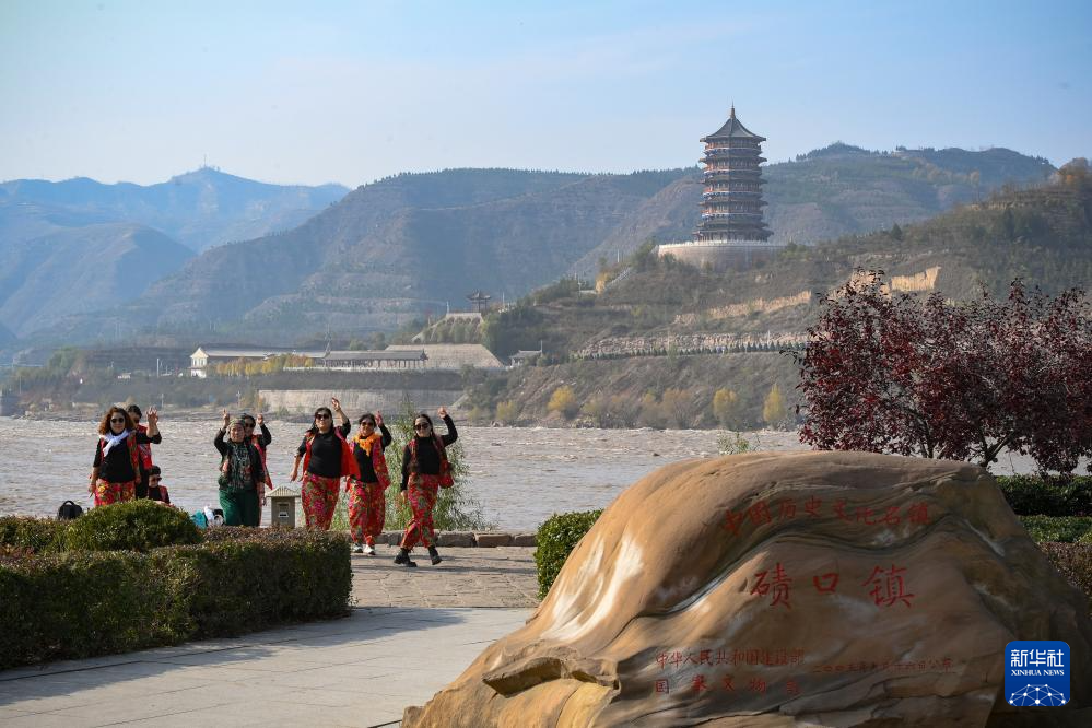 几名游客在碛口古镇跳舞休闲(10月30日摄)。