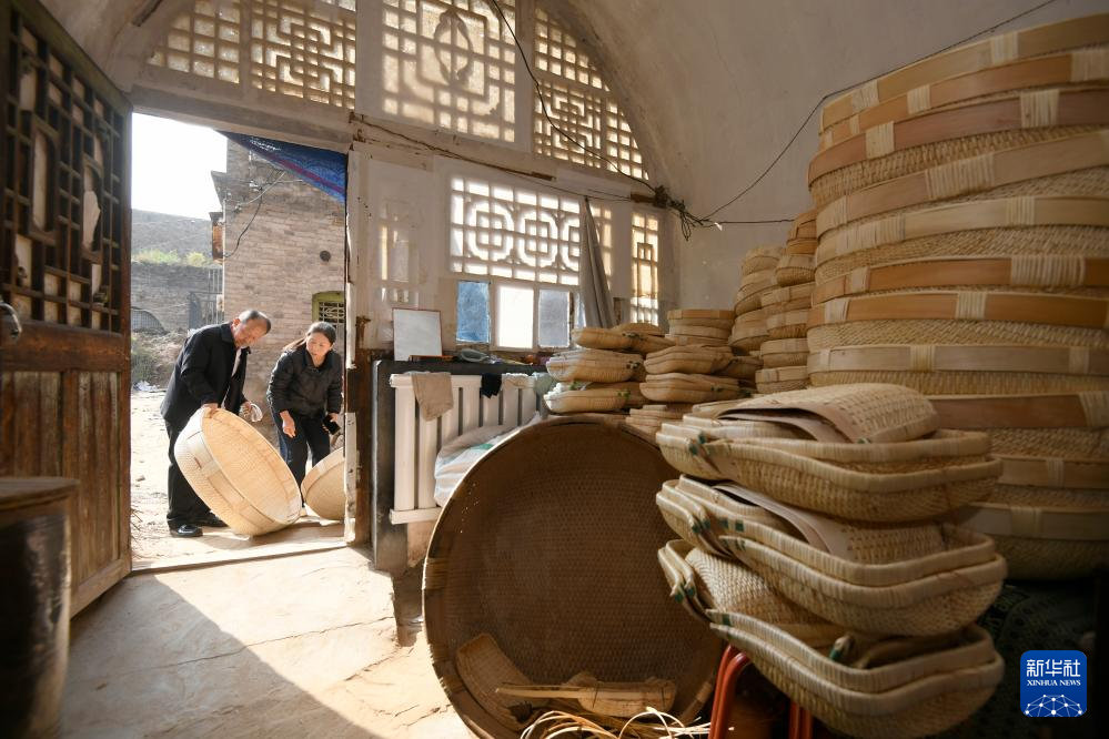 在碛口古镇,店家(右)向顾客介绍自己制作的柳编制品(10月30日摄)。